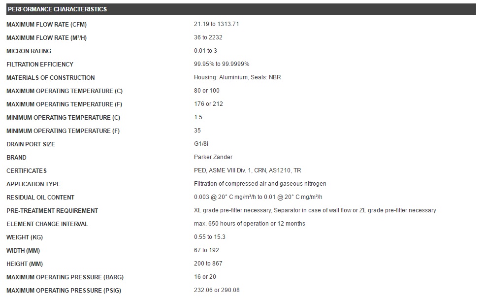 • ZL: general purpose filter, efficiency of 99.925%