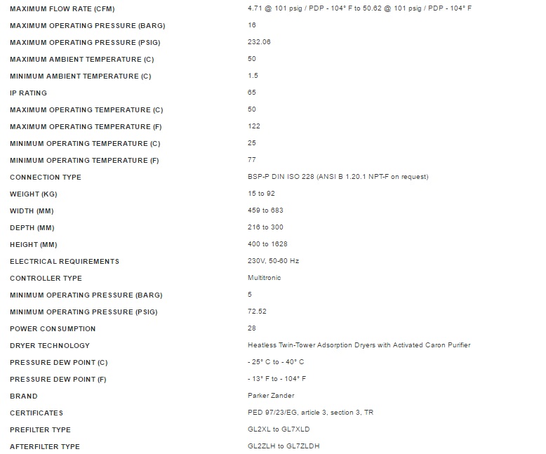 The Parker Zander KA-MT 1-8 range of heatless adsorption dryers with integrated activated carbon stage are designed to dry industrial compressed air reliably and efficiently down to a pressure dew point of -70°C and to a remaining oil content of 0,003 mg/m³. The units are compact and are designed to be installed free-standing or wall mounted. Compressed air dryers of the KA-MT series come with an integrated activated carbon stage for the removal of oil vapours and pre- and after filtration of the GL series, they are capable of volume flows up to 86 m³/h in a system operating at 7 barg (100 psig).